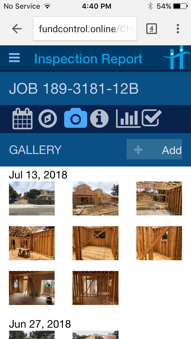 Scheduled jobs are routed to inspectors, who use a mobile phone or tablet to photograph and report the status of building line items, site conditions, and project progress.